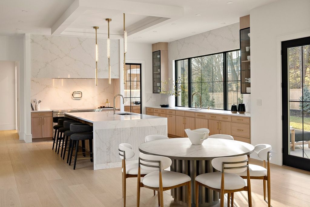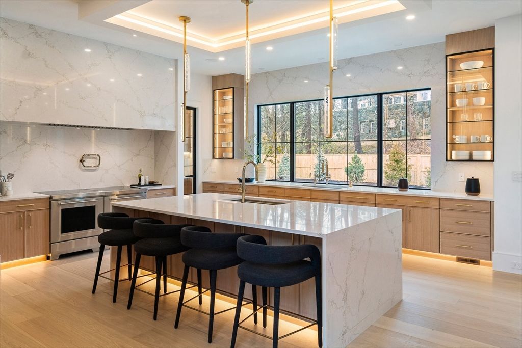 Designed for modern living and effortless entertaining, this home on the carriage lane of Commonwealth Ave in West Newton Hill offers a refined balance of open space and private retreat. The heart of the home is an oversized chefs kitchen with a generous center island and walk in pantry. The sun filled living room features a dramatic fireplace and quad sliders to a covered custom patio. The second floor offers four bedrooms, each with an ensuite bath and custom closets. The primary suite includes a walk in closet and spa inspired bath with beautiful stone, steam shower, and soaking tub. Two roof decks complete the level. The lower level features...read more