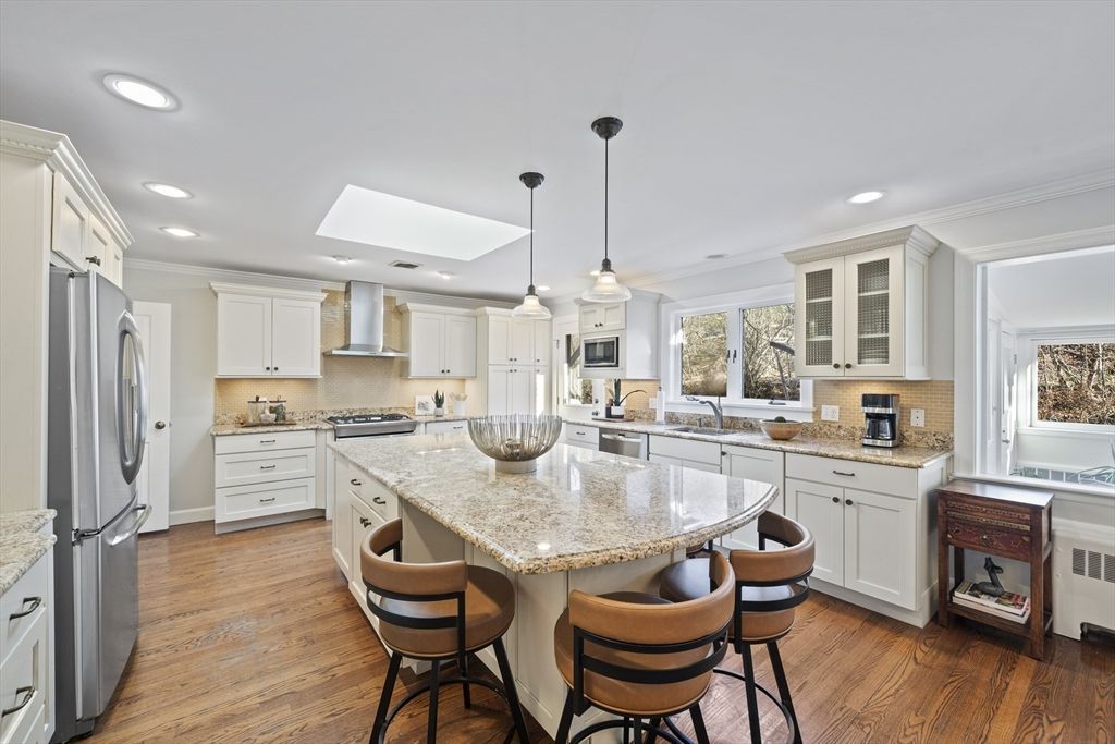 2009 expansive renovation of this charming and sun-filled home offers one level living in a fabulous, coveted Newton neighborhood. Beautiful open floor plan showcases the expansive fireplaced living room, with sunlight streaming in from every corner. Sprawling chefs kitchen offers skylit island with counter seating and adjacent formal dining room. Renovated sunroom next to the dining room provides an elegant, private retreat for morning coffee or evening repose. There are 4-5 bedrooms on the main living level, including a generous primary bedroom with en suite bath and multiple large windows, and another full bath on the same floor. Huge...read more